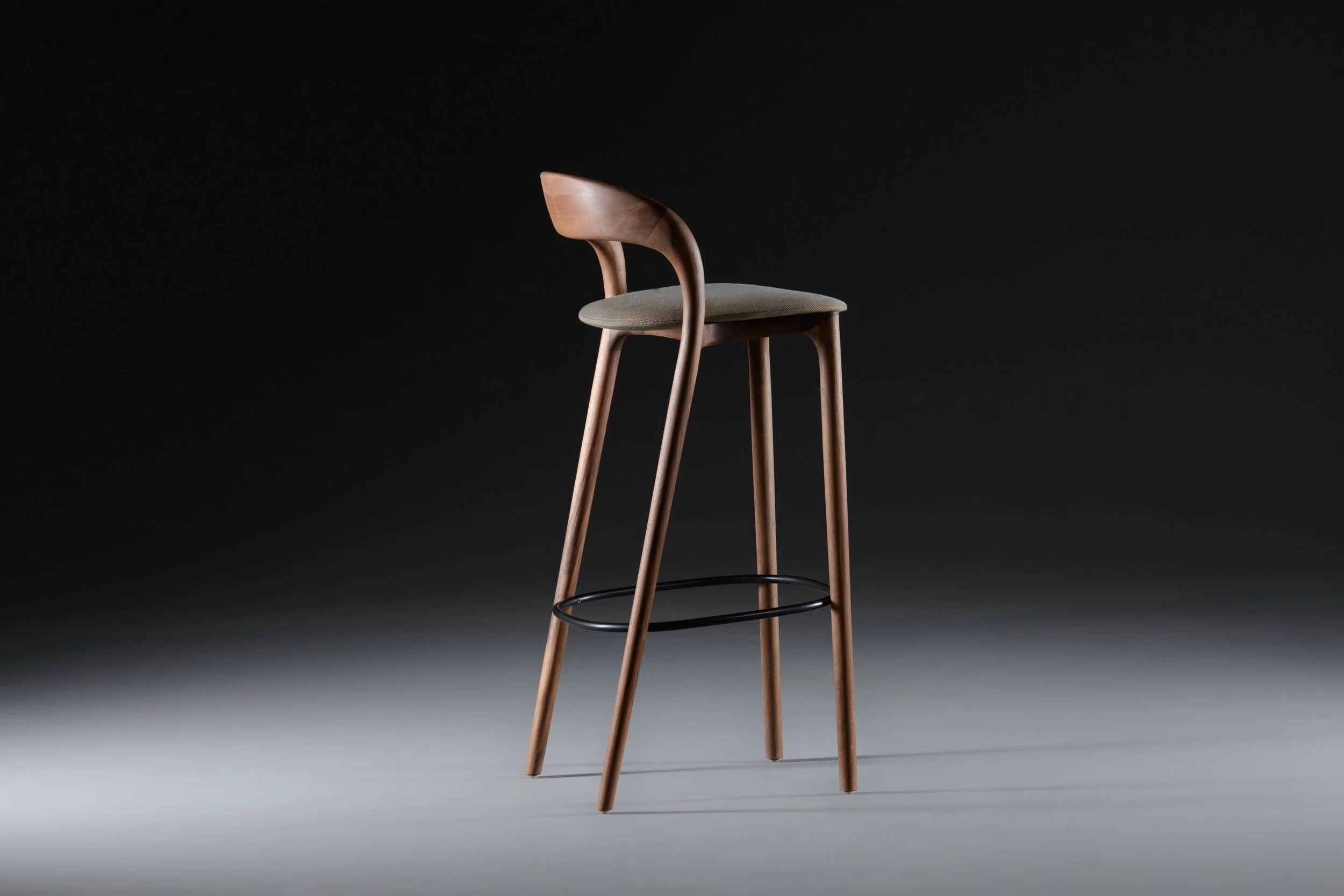 It is avaliable in 2 different heights - bar chair and counter chair, as well as 6 different types of wood (oak, walnut, maple, elm, cherry and pear), with various natural finishes (oils and soaps) upholstered with a range of leathers or fabrics.
